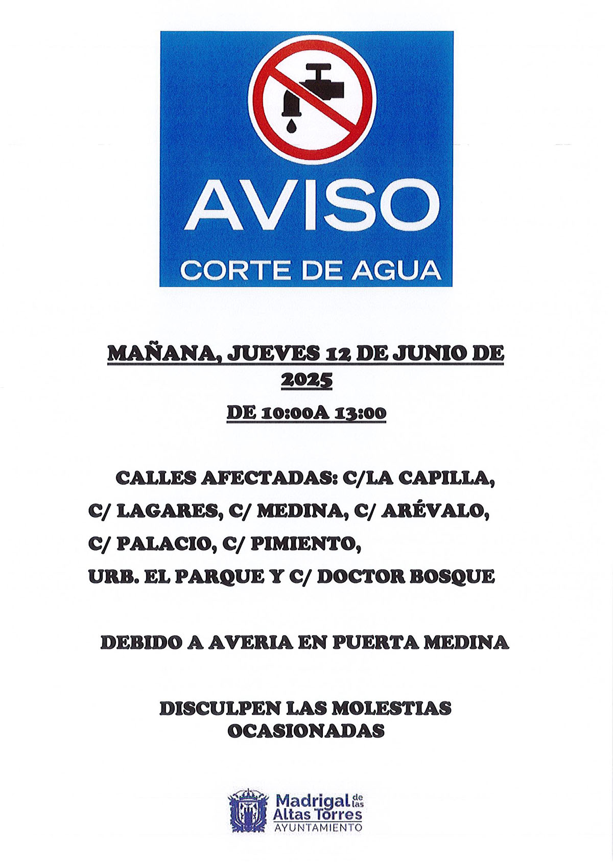 Aviso de corte de agua por avería en Puerta Medina para el jueves 12 de junio de 2025, de 10:00 a 13:00 en las calles indicadas en el cartel. Disculpen las molestias ocasionadas.
