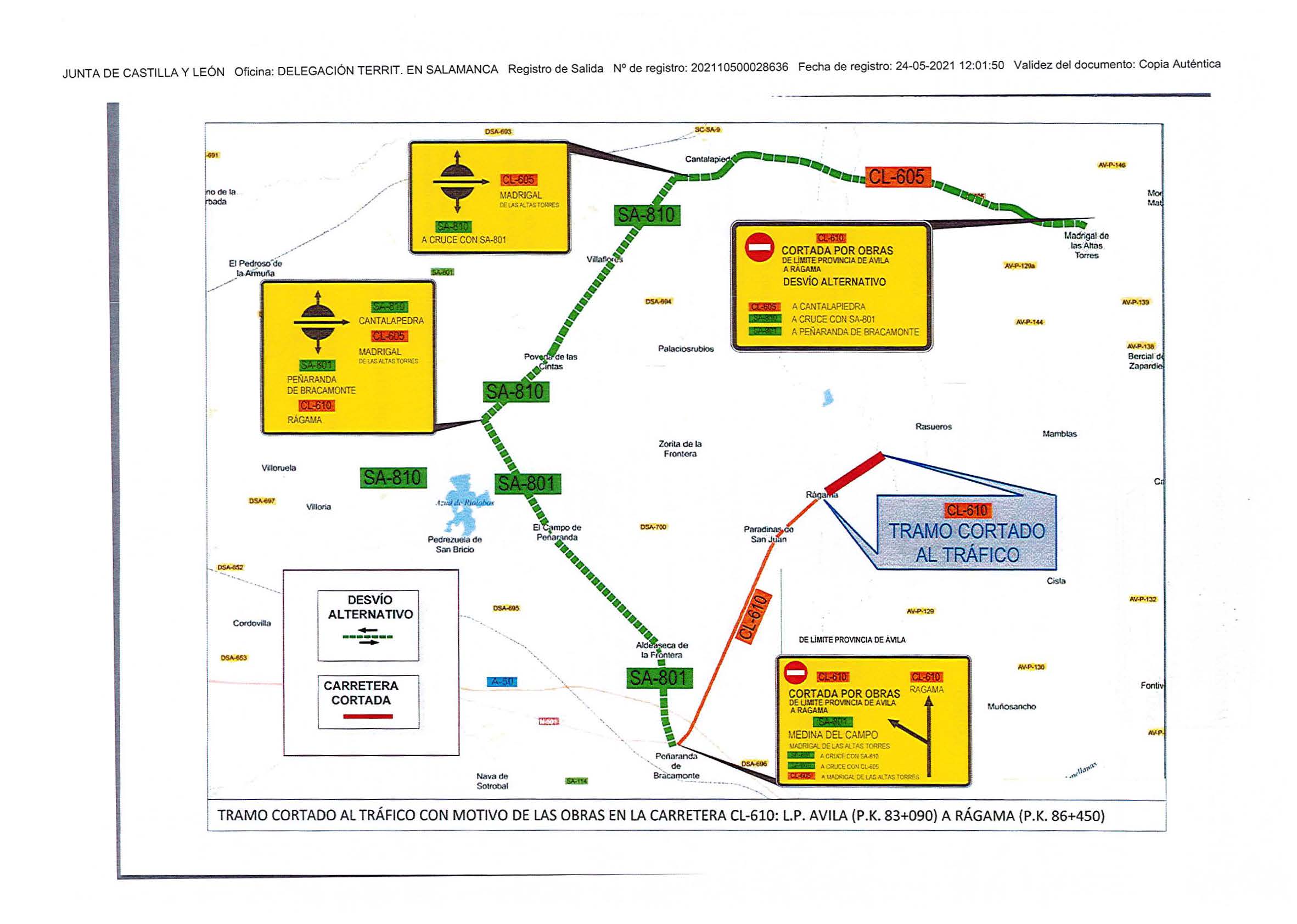 Se informa que, con motivo de la ejecución de las obras en la carretera CL-610, en el tramo entre el límite de provincia con Ávila y Peñaranda de Bracamonte, va a ser necesario cerrar al tráfico la carretera CL-610 en el tramo entre el límite de provincia de Ávila y Rágama, del p.k. 83+090 al 86+450.