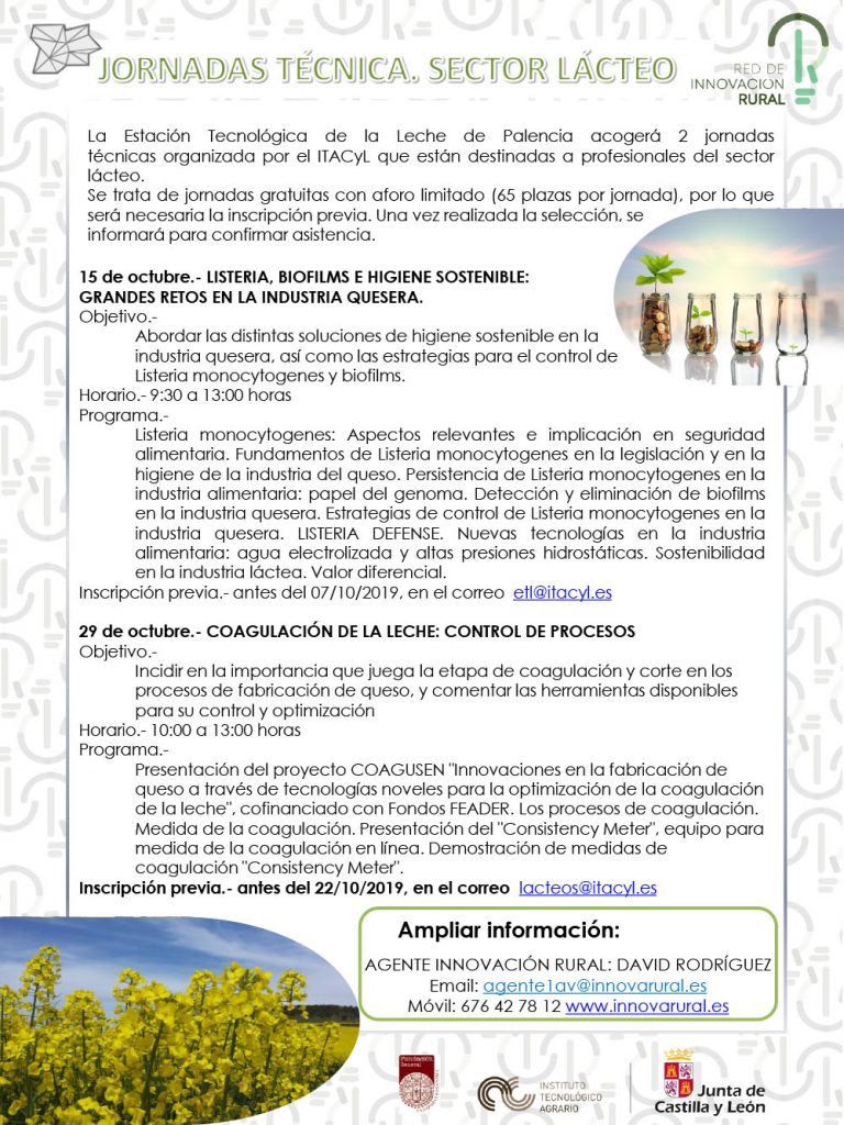 A través de la Red de Innovación Rural les informamos sobre las jornadas técnicas que se van a desarrollar en el mes de octubre en la Estación Tecnológica de la Leche ubicada en Palencia. Se tratan de jornadas específicas dirigidas al sector lácteo con la finalidad de actualizar sus capacidades competitivas y habilidades, al tiempo que se difunden los resultados de proyectos de investigación y avances científicos.