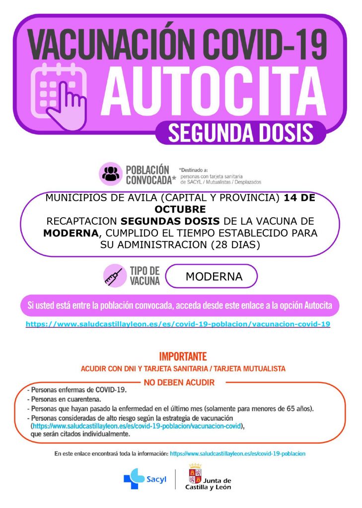 Vacunación COVID-19 AUTOCITA (Segundas dosis): Ávila el 14 de octubre (vacuna Moderna)