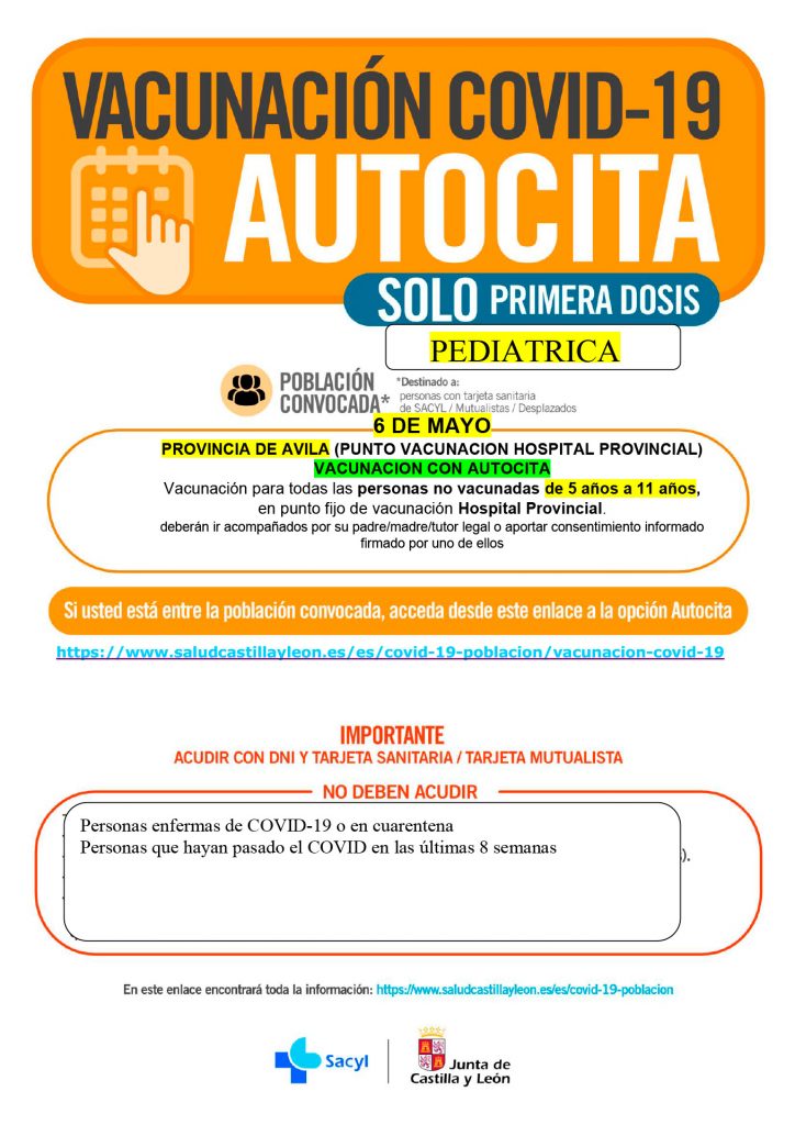 Vacunación COVID-19 Pediátrica AUTOCITA: Ávila el 6 de mayo (sólo 1ª dosis, de 5 a 11 años)