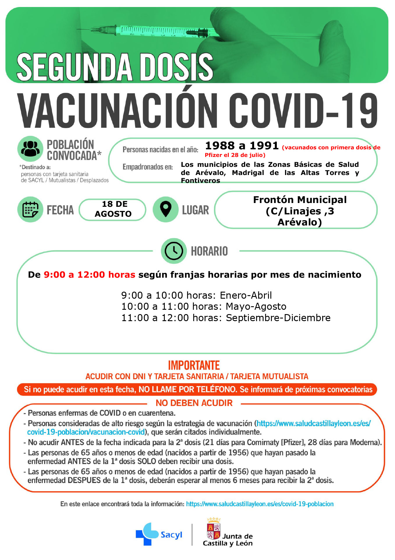 Vacunación COVID-19 (Segundas Dosis): Arévalo el 18 de agosto, personas nacidas de 1988 a 1991
